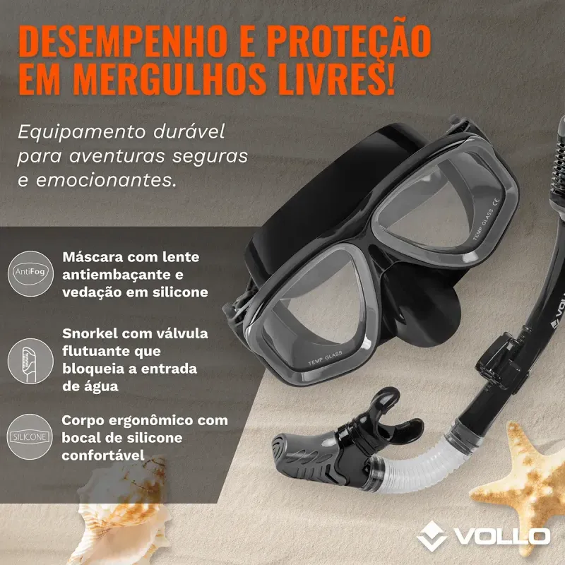 O Kit de Mergulho Adulto Vollo é ideal para mergulho em superfície, oferece uma experiência incrível de mergulho livre.