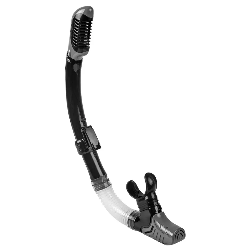 O Snorkel possui uma válvula flutuante que veda o tubo para bloquear a entrada de água quando submerso na água, e bocal de silicone confortável de alta qualidade, macio e facilmente adaptável à boca. Além disso, possui fivela que permite conectar facilmente o snorkel à máscara.