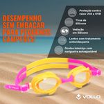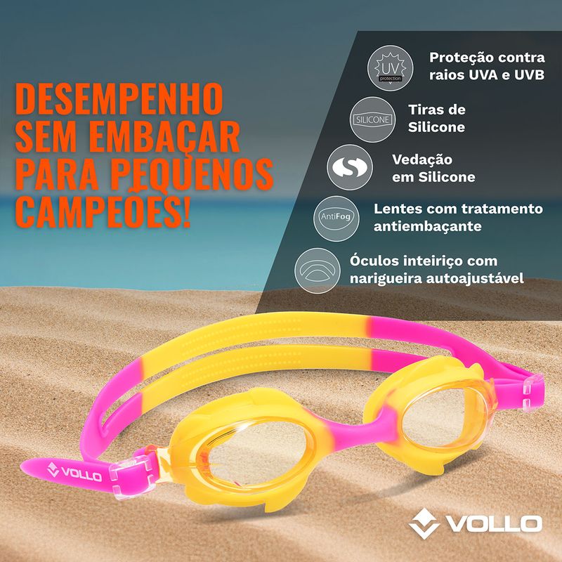 Para os treinos diários de natação, os Óculos Infantil Shark Fin Rosa e Amarelo Vollo são excelentes aliados! Com incrível design à prova d'água, os óculos de natação garantem maior proteção aos olhos, evitando a entrada indesejada de água graças a sua vedação altamente eficaz. Com design clássico o Shark Fin, possui lentes com tratamento antiembaçante e proteção UV que proporciona ao nadador excelente desempenho durante todo o treinamento.