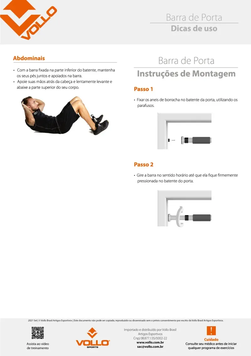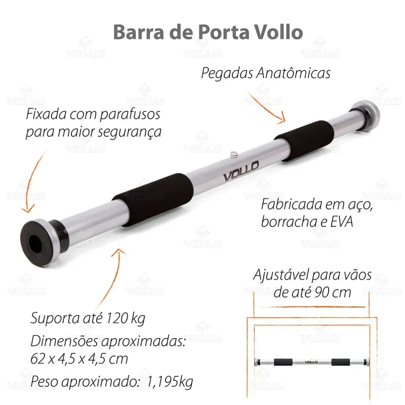 Produzida em matéria prima de alta qualidade, a Barra de Porta Vollo é adepta de uma segurança completa em seu mecanismo de instalação, assim como na execução das suas atividades. Viu como pode ser prático manter o treino e sem perder a motivação? Adquira já a sua Barra de Porta Vollo e supere seus desafios!