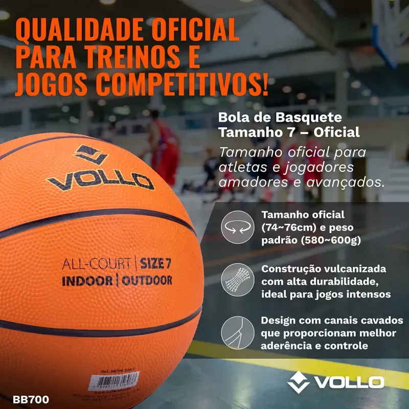 E tem mais, a bola de basquetebol da Vollo possui tamanho oficial para as competições masculinas, além de texturas na superfície que garantem maior aderência, controle e precisão no momento do passe ou arremessos. Marque a sua cesta com estilo com a Bola de Basquete Vollo!