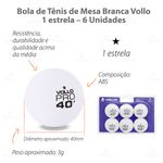 A Bola de Tênis de Mesa Branca com 6 Unidades Vollo possui resistência, durabilidade e qualidade acima da média, graças aos rigorosos processos de fabricação que seguem as especificações técnicas das federações e confederações de tênis de mesa. Além de testes contínuos em laboratório que garante a excelência do produto.