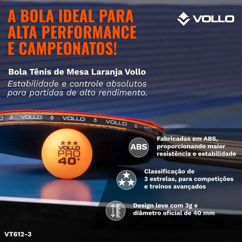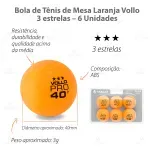 A Bola de Tênis de Mesa Laranja com 6 Unidades Vollo possui resistência, durabilidade e qualidade acima da média, graças aos rigorosos processos de fabricação que seguem as especificações técnicas das federações e confederações de tênis de mesa. Além de testes contínuos em laboratório que garante a excelência do produto.