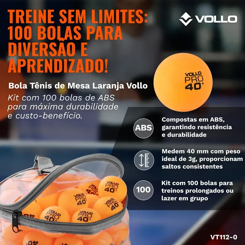 A Bola de Tênis de Mesa com 100 unidades Vollo é perfeito para jogadores iniciantes treinarem as suas habilidades no ping-pong ou até mesmo para se divertirem com toda a família e amigos nos momentos de lazer. Todas as 100 bolas de ping-pong passaram por um processo rigoroso de testes em laboratório para garantir a melhor resistência, durabilidade e segurança para os jogadores. Produzida em ABS são mais redondas e saltam na altura certa. E o melhor? Com o kit de 100 bolas de tênis de mesa você garante muitas horas de diversão com o melhor custo-benefício e qualidade certificada Vollo. Pode apostar!