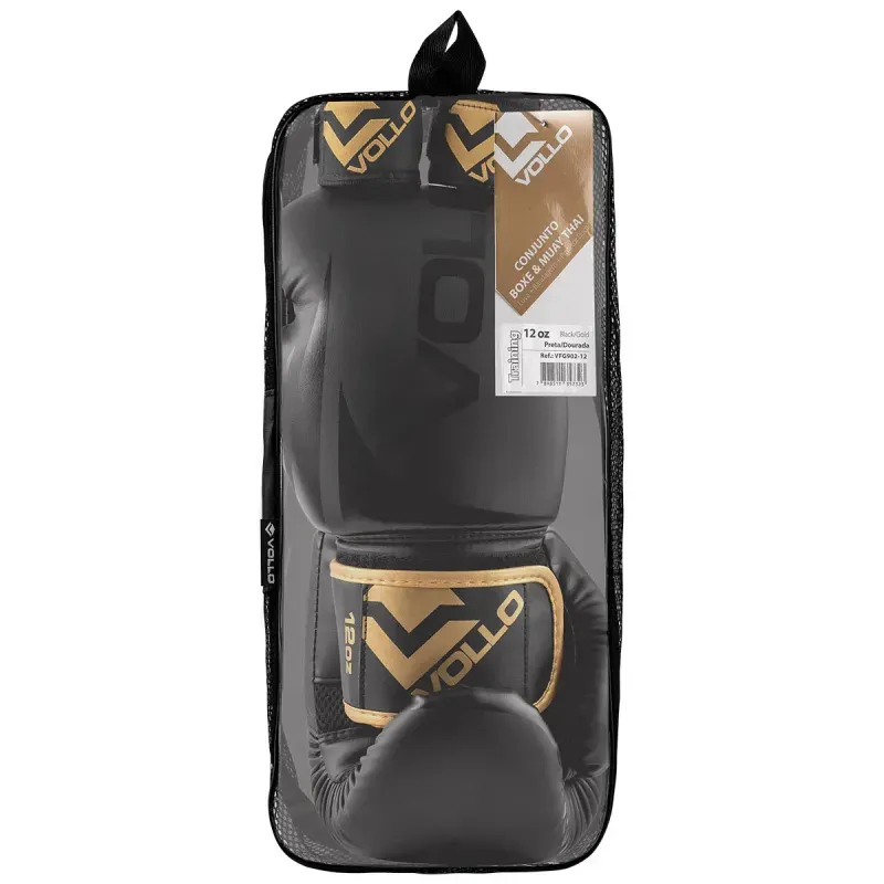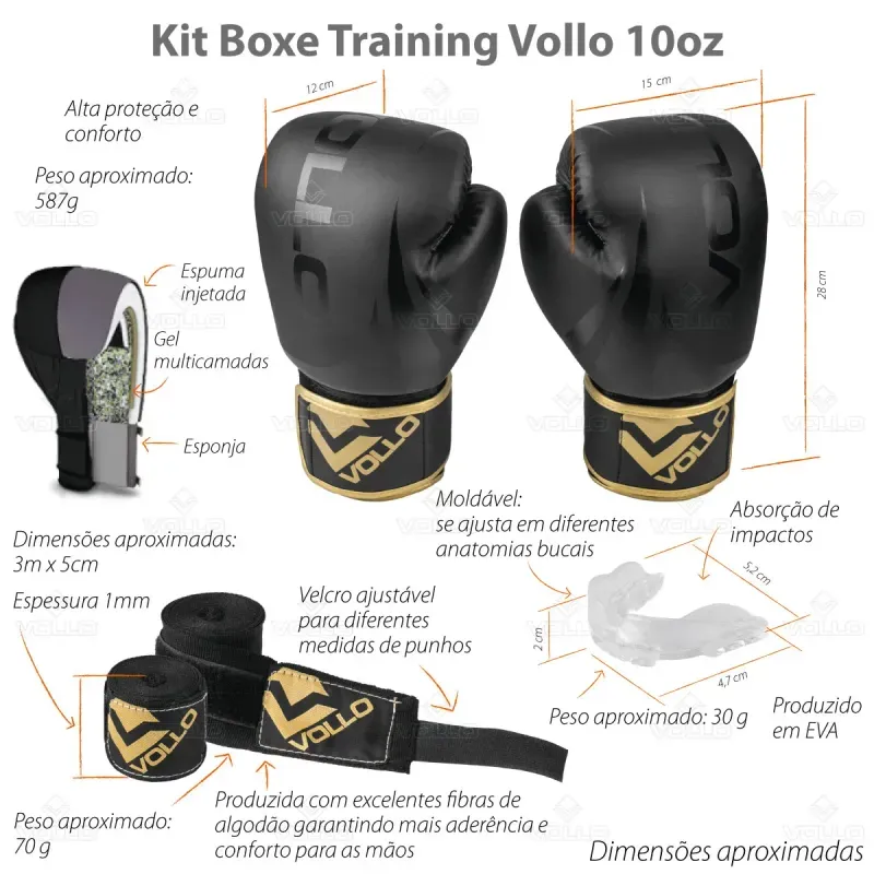 Kit de Boxe e Muay Thai Training Luva 10Oz Protetor Bucal e Bandagem 3M Vollo