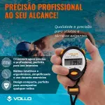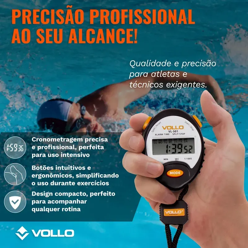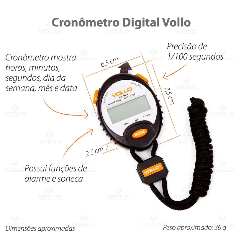 O Cronômetro Digital Vollo profissional é aquele acessório indispensável para ter sempre a mão durante a prática esportiva, seja caminhando, correndo, treinando musculação ou aeróbico, o temporizador não pode faltar para te auxiliar na marcação do tempo, durante o intervalo de descanso ou para percorrer e alcançar aquele tempo tão desejado. Seja você um atleta profissional, iniciante ou educador físico, marcar e saber o seu tempo e o quanto pode melhorar é crucial para o desenvolvimento e evolução. Por isso, conte com o cronômetro eletrônico da Vollo que além de te ajudar a medir o tempo, possui hora, data, alarme, precisão de 1/100 segundos e ainda contém cordão para transporte. Supere seus limites!