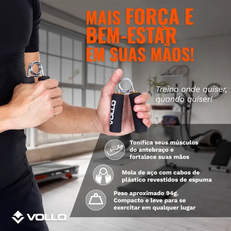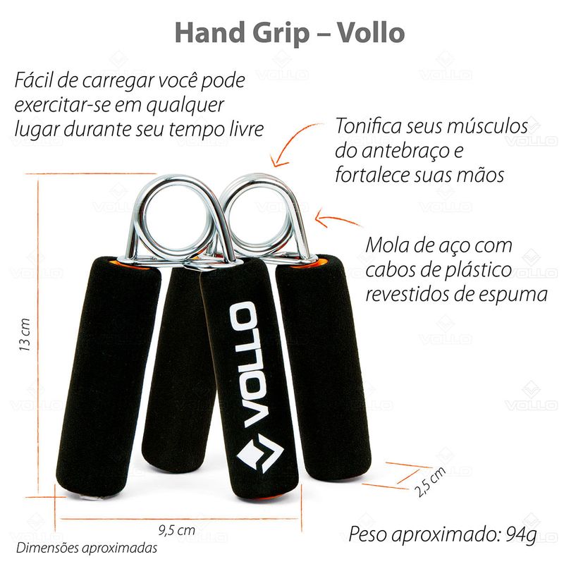 Hand Grip Com Cabo de Espuma Vollo. Com formato anatômico e cabo espumado, o hand grip garante mais conforto e bem-estar ao realizar os exercícios. O equipamento é ideal para o fortalecimento, para a reabilitação que age na recuperação de lesões, deixando os músculos trabalhados mais fortes e também para quem utiliza o computador por tempo prolongado ou faz ações muito repetitivas com as mãos, essa falta de estímulo pode tornar a musculatura da mão fraca, ocasionando em dores.