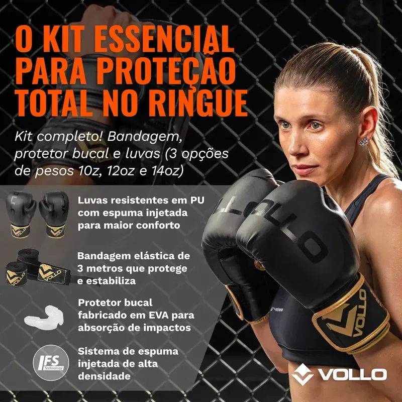 Elaborado por procedimentos que visam cuidados com a saúde de atletas profissionais ou amadores, o Kit de Boxe e Muay Thai Training Vollo é completo, composto por luva, protetor bucal e bandagem de 3 metros, apresenta alta tecnologia e design que revigoram sua utilidade, sendo implacável em promover maior potência, conforto e estabilidade para seu proveito.