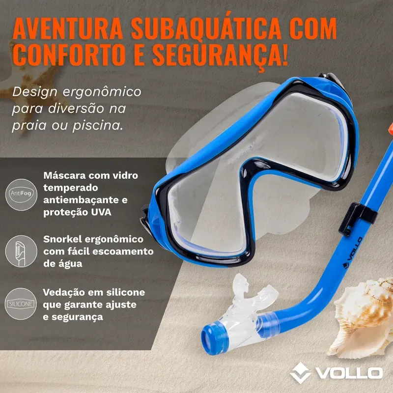 O Kit de Mergulho Infantil Vollo oferece uma experiência incrível de mergulho livre para as crianças. Desenvolvido especialmente para o conforto e segurança dos pequenos, é uma excelente opção para praia ou piscina.