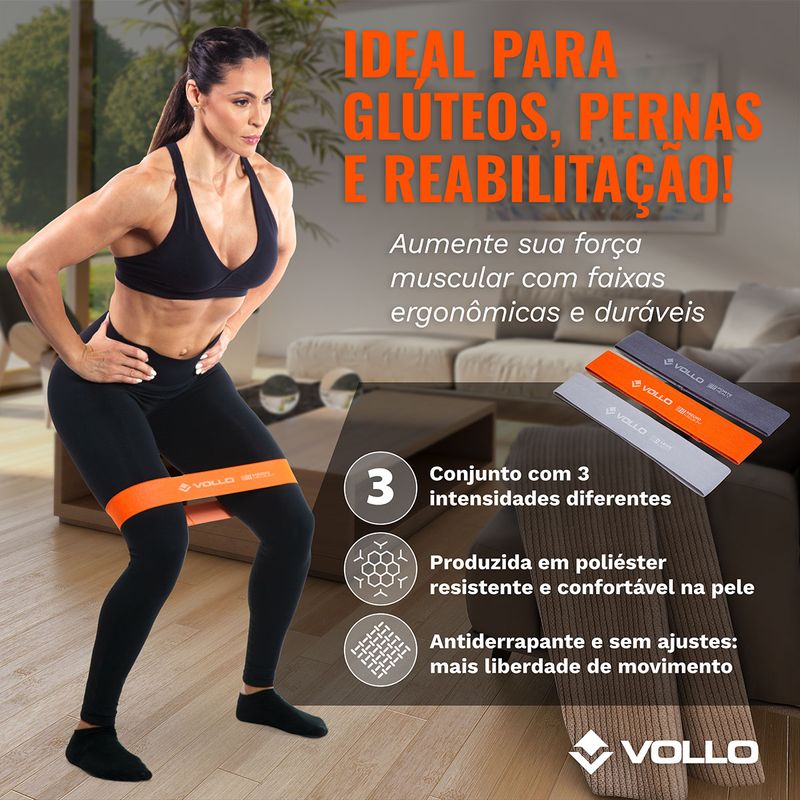 O Kit Loop Band Vollo vem com três intensidades diferentes leve, médio e forte, permitindo evolução progressiva e personalização do treino conforme o seu nível de resistência. Ideal para exercitar glúteos, quadríceps, panturrilhas, coxas e outras regiões, o kit proporciona o fortalecimento muscular completo, melhora do condicionamento físico e mais estabilidade nas articulações. O tecido em poliéster entrelaçado com borracha natural garante firmeza e conforto em cada movimento.