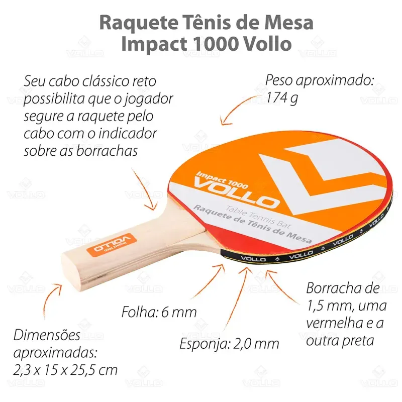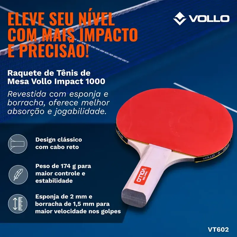 Pratique suas melhores jogadas com a Raquete de Tênis de Mesa Impact 1000 Vollo criada especialmente para atletas intermediários que buscam se aperfeiçoar nos treinos para campeonatos ou por hobbies. A Raquete de ping-pong Impact 1000 possui os dois lados revestidos com borracha, sendo um lado vermelho e o outro preto, seguindo as regras da federação internacional de tênis de mesa (ITTF), e ainda conta com esponja de 2,0 mm, que por ser mais espessa garante tiros com maior velocidade. Seu cabo clássico reto possibilita que o jogador segure a raquete pelo cabo com o indicador sobre as borrachas, sendo o modelo mais usado pelos iniciantes e intermediários.