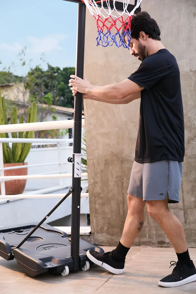 Com a altura ajustável de 1,00 m a 3,05 m, permite adaptar o equipamento para crianças, adolescentes e adultos. Sua base de polietileno (PE) pode ser preenchida com água ou areia, garantindo estabilidade e segurança durante as jogadas. A mobilidade é outro ponto forte: equipada com rodas na parte frontal, você pode facilmente mover e posicionar a cesta em qualquer lugar.